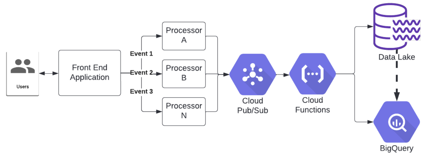A common practice in cloud data engineering is to use an intermediary processor to house and manage event data. Cloud platforms offer messaging services which can collate and proliferate data to multiple sources or endpoints. The data are concentrated and housed in a single collection point which collates multiple streams of data. This is important for data processing efficiency and security as it offers a single point of contact for all of your various applications. In AWS this service is Simple Queue Service and in GCP this is known as PubSub.