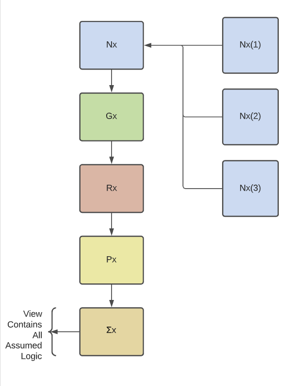 The left-hand image depicts a possible execution flow. The user calls the view using a SELECT statement. This is a SELECT statement FROM Σx. However, what happens is that the query engine plans the path for executing all preceding queries as well. Σx is a SELECT statement FROM Px which is a SELECT statement FROM Rx which is a SELECT statement FROM Gx which is a SELECT statement FROM Nx. Nx is a base query which is a SELECT statement FROM sources Nx(1), Nx(2), AND Nx(3). All of this logic is assumed by simply querying the end view, Σx.
